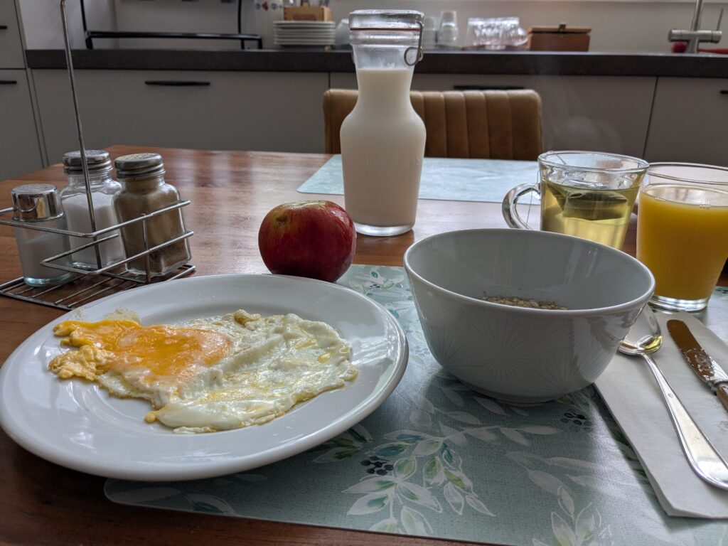 Ik ben een nachtje er tussen uit. Uitrusten, met niemand rekening hoeven houden. Gisteravond heb ik een heerlijke strandwandeling gemaakt. Zo meteen ga ik de duinen in. Maar eerst geniet ik nog even van mijn ontbijt: beetje van mijzelf (de muesli), beetje van de Casa (oa yoghurt en een gebakken eitje).