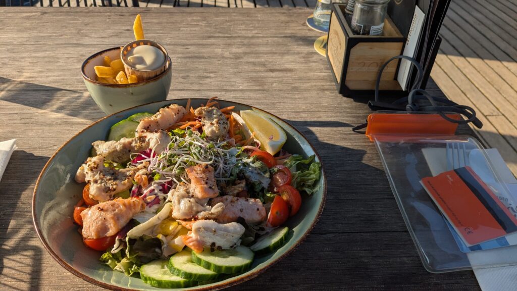 Hij (de kok) kwam even bij mij aan tafel zitten en vertelde over alle mensen die van heinde en verre naar Velsen komen voor de glutenvrije spareribs en glutenvrije kibbeling. En hij wil daar nog de glutenvrije bitterballen en broodje kroket aan toevoegen. Samen deelden we een grote bitterbal en ik moet toegeven: die is heerlijk!