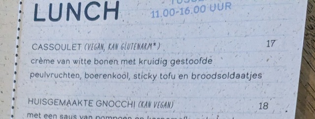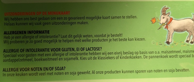 Een kwartiertje later kreeg ik deze kaart onder ogen: glutenarm… Bij navraag bleek dat in de keuken te veel kruimels en te veel rondvliegend meel te zijn. Jammer dat we dat niet meteen hoorden….