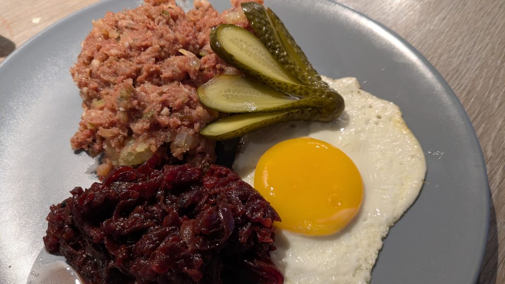 Labskaus is ‘oneerbiedig’ gezegd een Noord-Europese stamppot van aardappelen, uien, augurken, corned beef, haring, geserveerd met koude bietjes, peterselie een gebakken ei en een augurkenwaaiertje. (Een octopus, aldus mijn dochter van 6).