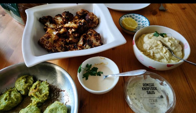 Geroosterde bloemkool, humus, tahini en een poging tot Egyptische falafel (ta’ameya). Helaas loste die laatste op in de frituurpan en was de rest ook niet echt smakelijk.