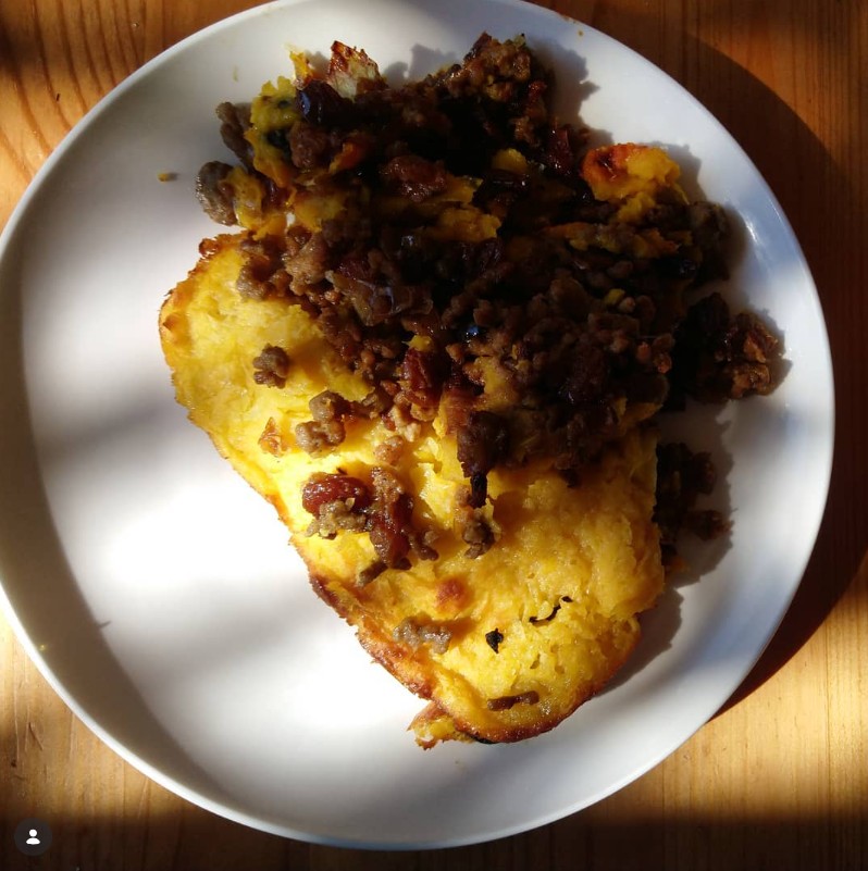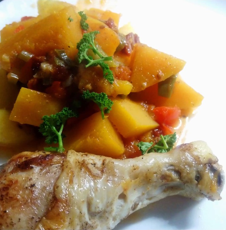Ik maakte een lekker stoofpotje 🥘 met pompoen 🎃 , aardappel, paprika, tomaat, olijf en kruiden. Daarbij een kippenpoot.