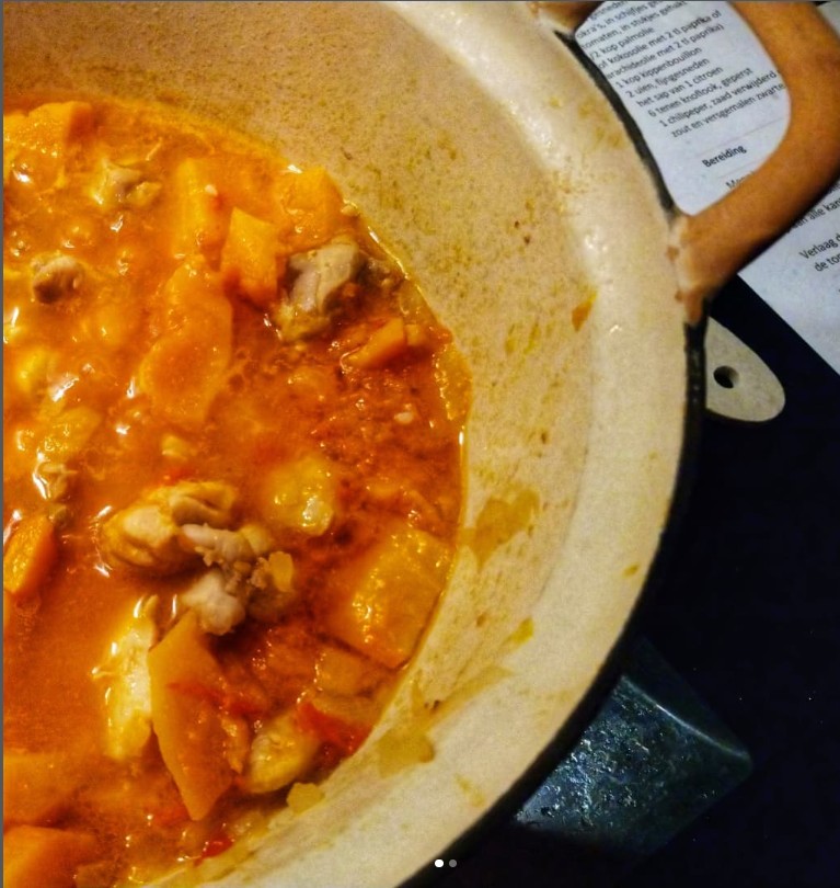Ik maakte muambs de galinha, een stoofgerecht met kip 🐔 en pompoen 🎃. Mijn meisjes vonden het een beetje lekker en ik kreeg 💛.